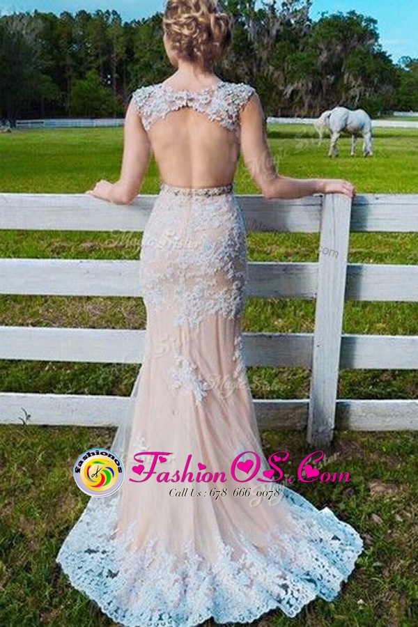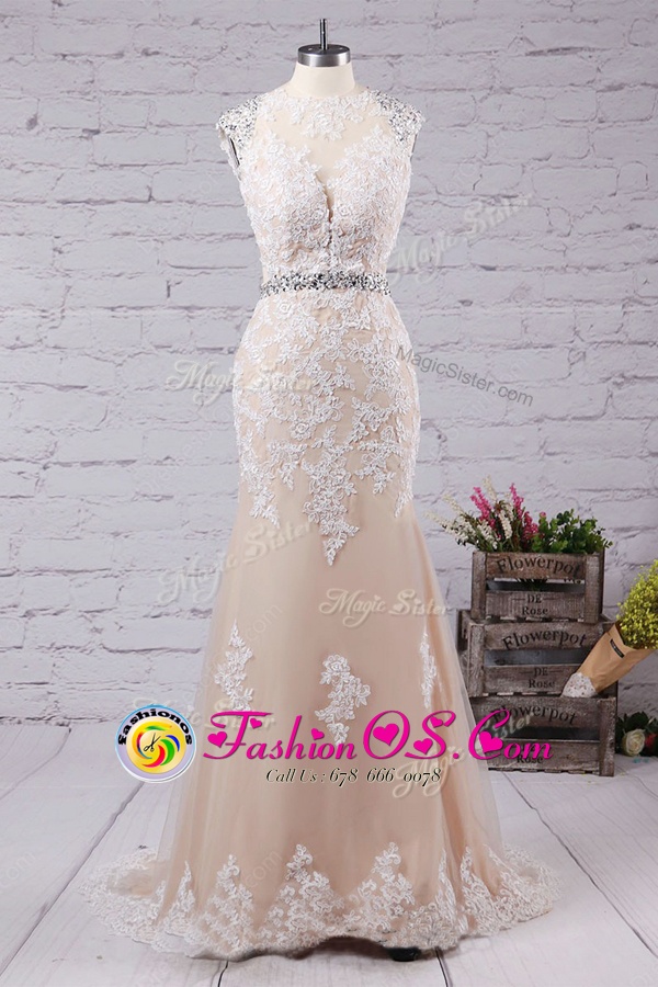 Home >  Prom Dresses >  Perfect Prom Dresses > Super Mermaid Scoop Sleeveless Tulle Evening Dress Beading and Appliques Sweep Train Backless