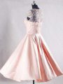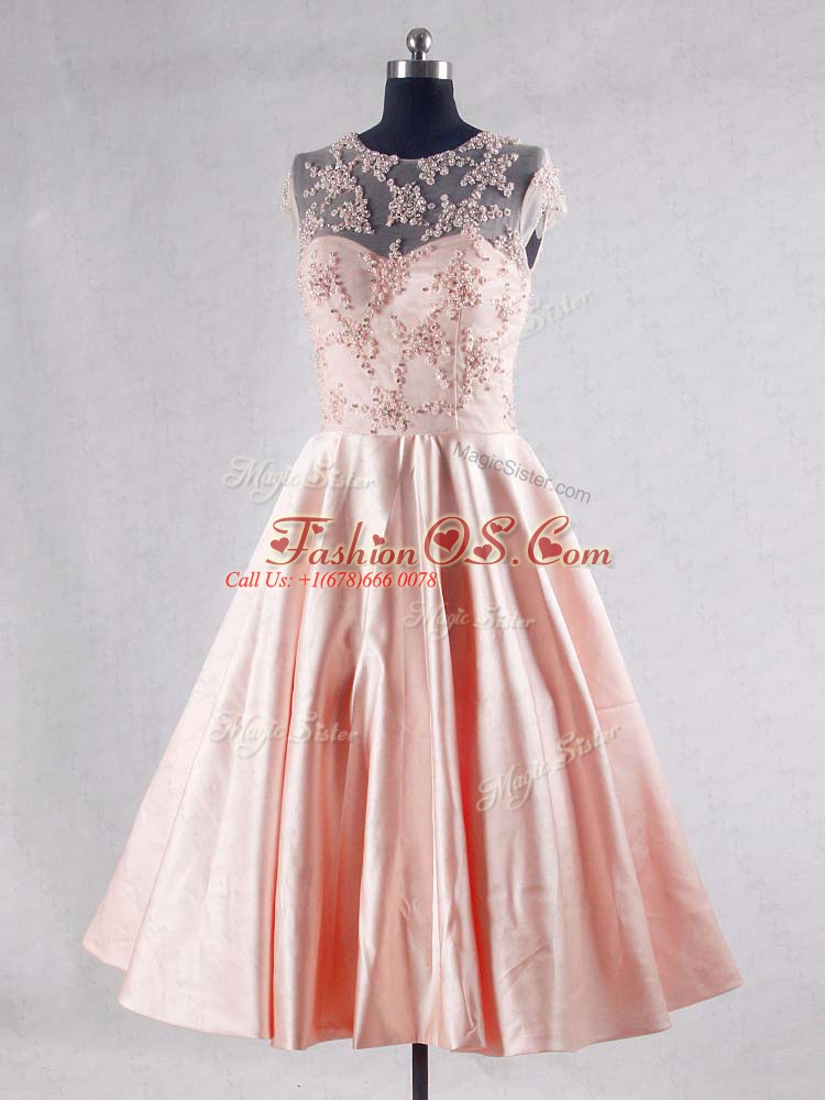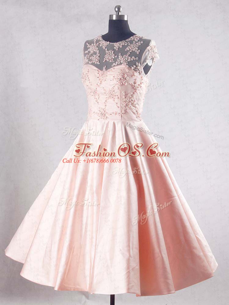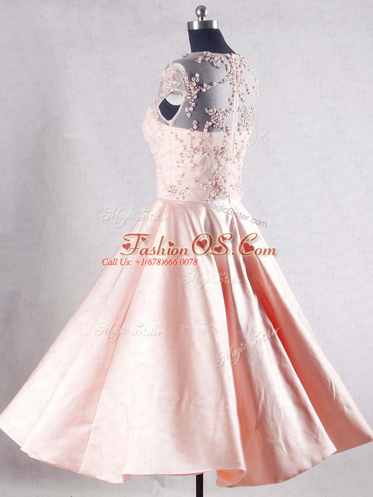 Super Scoop Sleeveless Knee Length Beading and Appliques Pink Taffeta