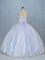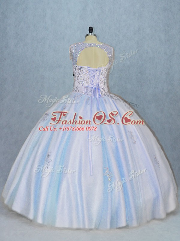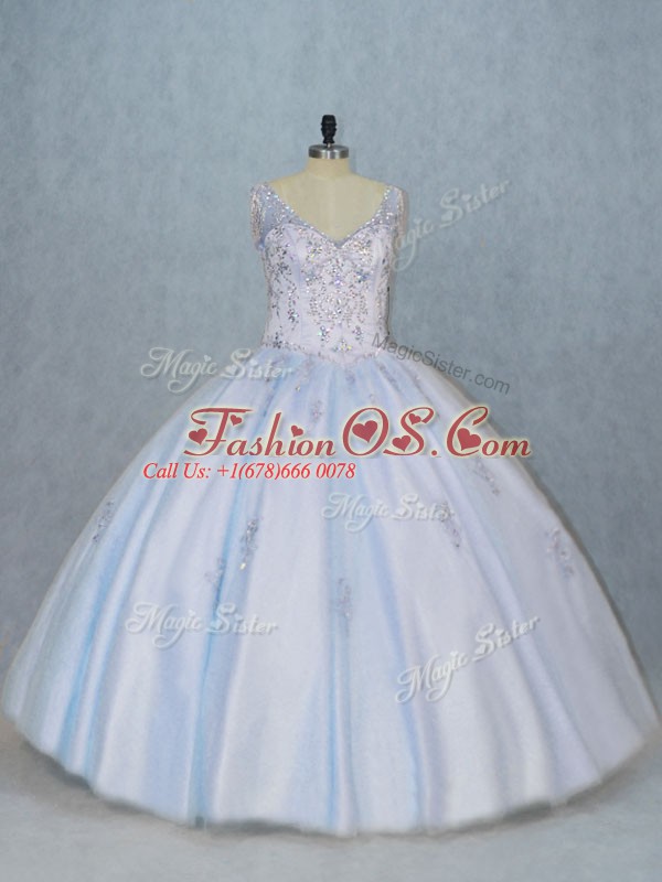 Super V-neck Sleeveless Quince Ball Gowns Floor Length Beading Blue Tulle