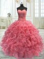 Home >  Quinceanera Dresses >  Cute Quinceanera Dresses > Super Watermelon Red Sleeveless Floor Length Beading and Ruffles Lace Up Sweet 16 Dresses