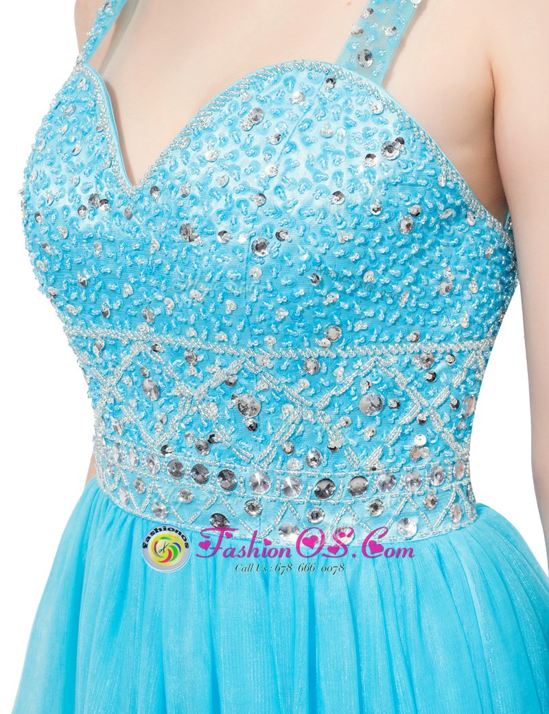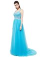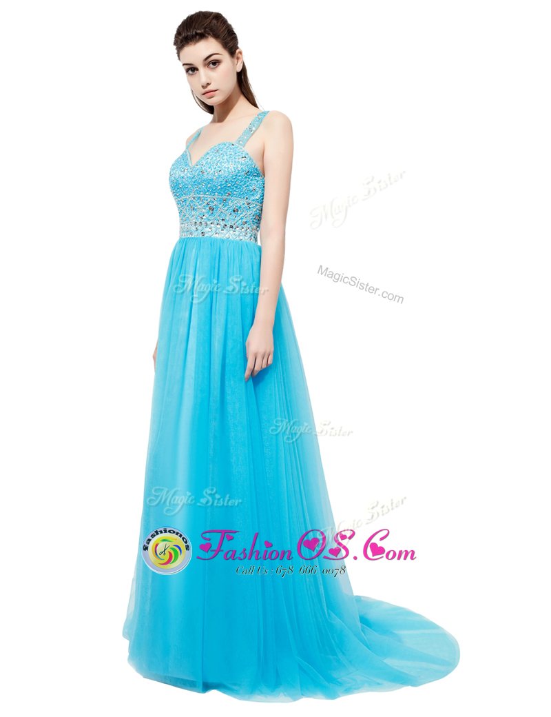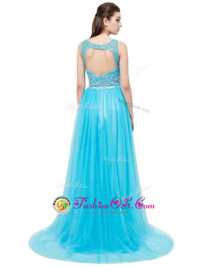 Home >  Prom Dresses >  Prom Dresses On Sale > Superior Aqua Blue Sleeveless Brush Train Beading With Train