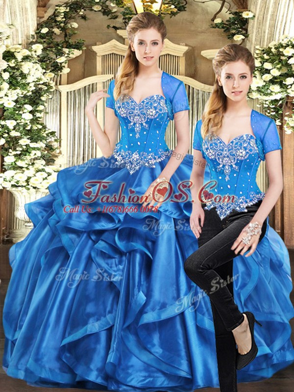 Superior Blue Two Pieces Beading and Ruffles Ball Gown Prom Dress Lace Up Organza Sleeveless Floor Length
