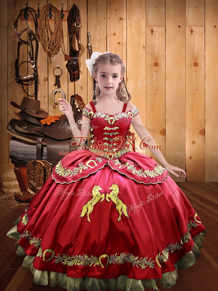 Home >  Special Occasion Dresses >  Pretty Little Girl Pageant Dresses > Superior Floor Length Coral Red Kids Formal Wear Off The Shoulder Sleeveless Lace Up