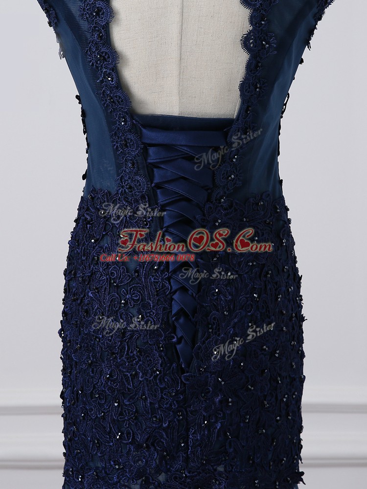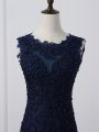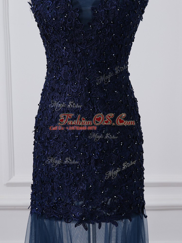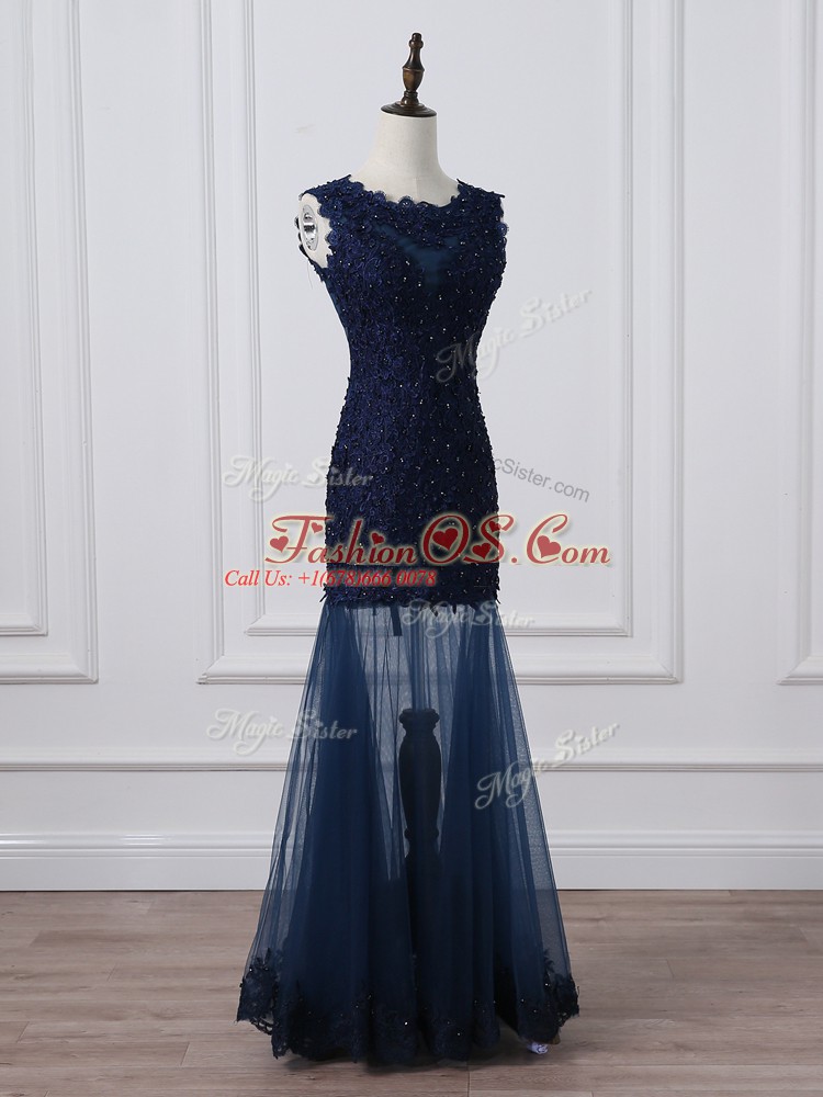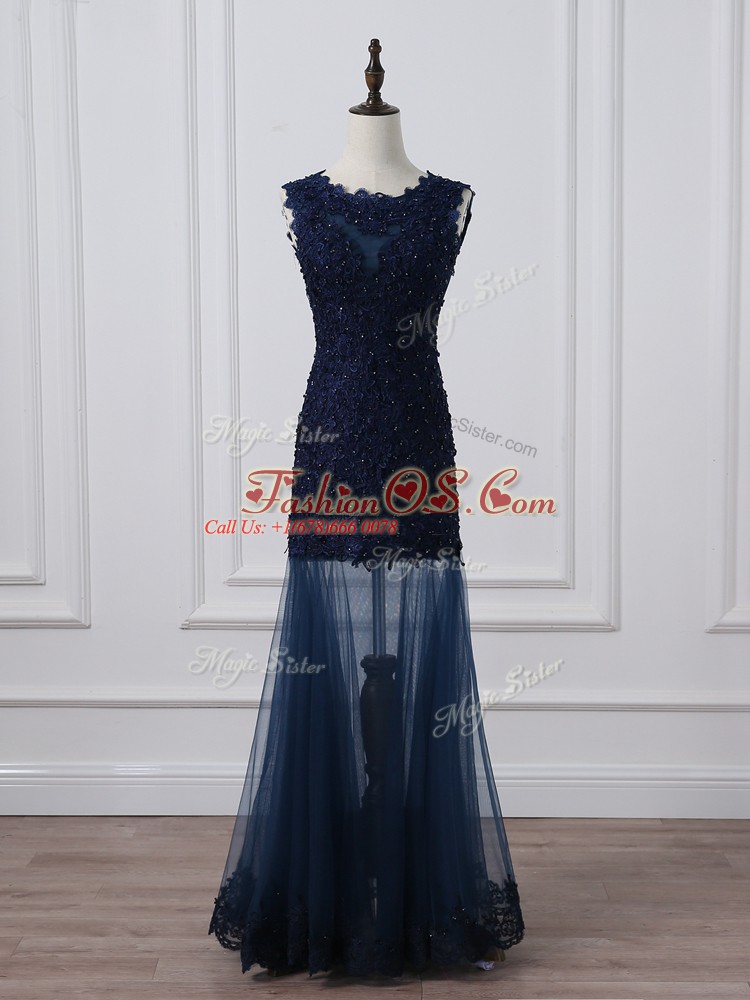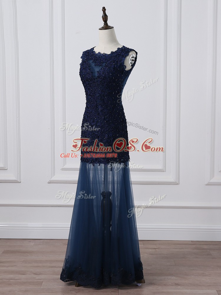 Superior Floor Length Navy Blue Mother Of The Bride Dress Tulle Sleeveless Lace and Appliques