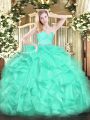 Superior Floor Length Zipper Ball Gown Prom Dress Turquoise for Military Ball and Sweet 16 and Quinceanera with Beading and Lace and Ruffles