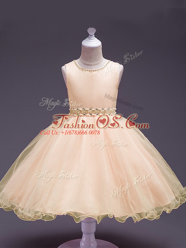 Superior Peach Sleeveless Knee Length Beading Zipper Girls Pageant Dresses