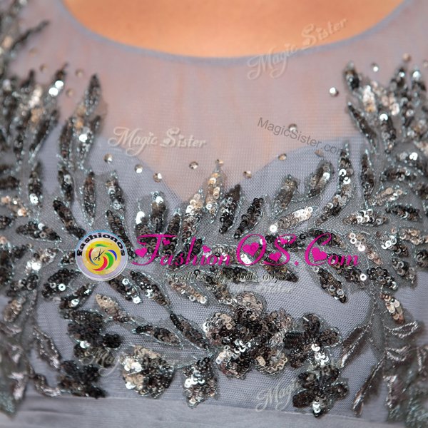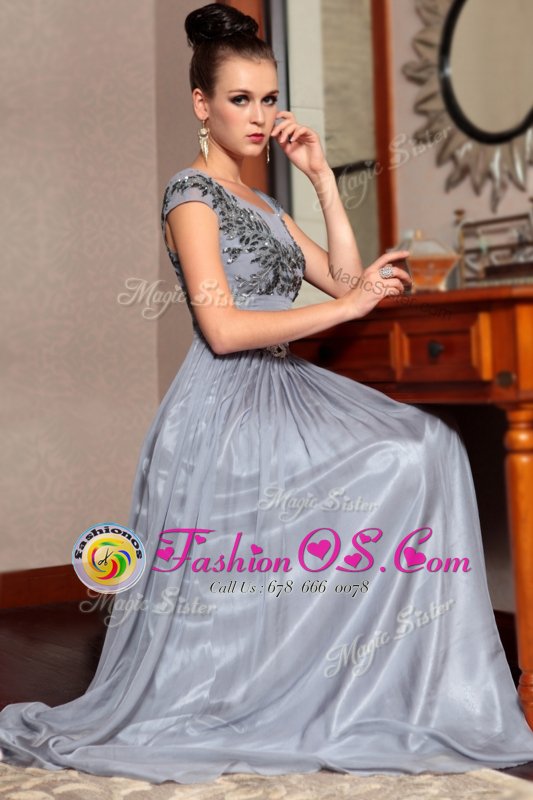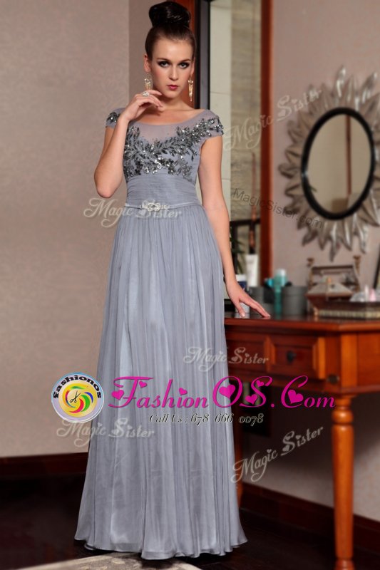 Home >  Prom Dresses >  Perfect Prom Dresses > Superior Sequins Column/Sheath Prom Gown Grey Scoop Chiffon Cap Sleeves Floor Length Side Zipper