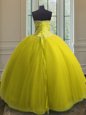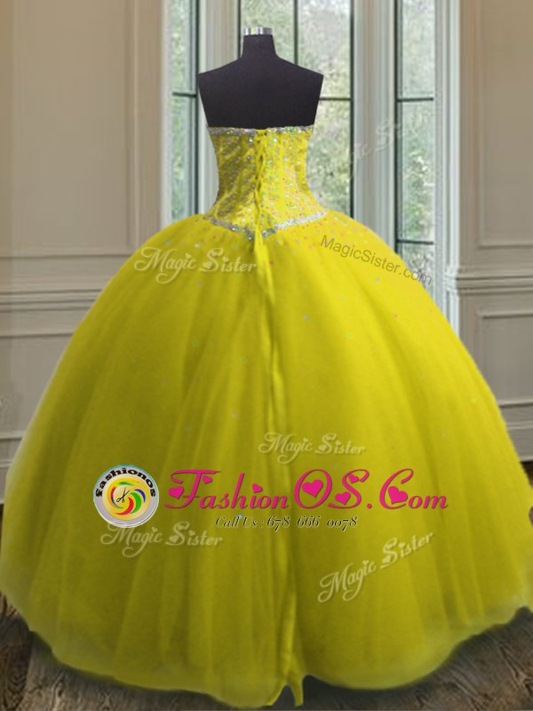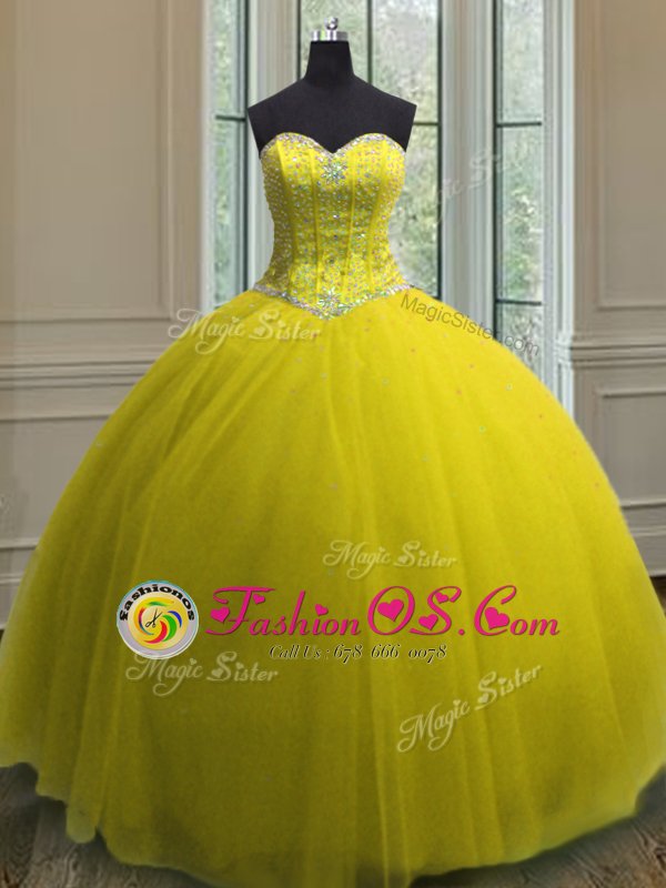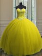 Superior Yellow Ball Gowns Sweetheart Sleeveless Tulle Floor Length Lace Up Beading and Sequins Quinceanera Gowns