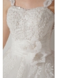 You`re sure to be on cloud nine when you check yourself out in this fanciful and fabulous creation! The strapless bodice supported by broad laced straps. The fitted torso stands out for bulky lace embroidery and the dropped waist is highlighted by a chic flower.The flared, floor-length skirt made of soft and flowy tulle is worked to produce eye-catching impression.Dramatically tiered layers whirl and swirl every which way on the elaborately appointed skirt.