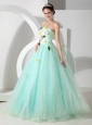 Sweet Apple Green A-line Strapless Quinceanera Dress Organza Hand Made Flowers Floor-length