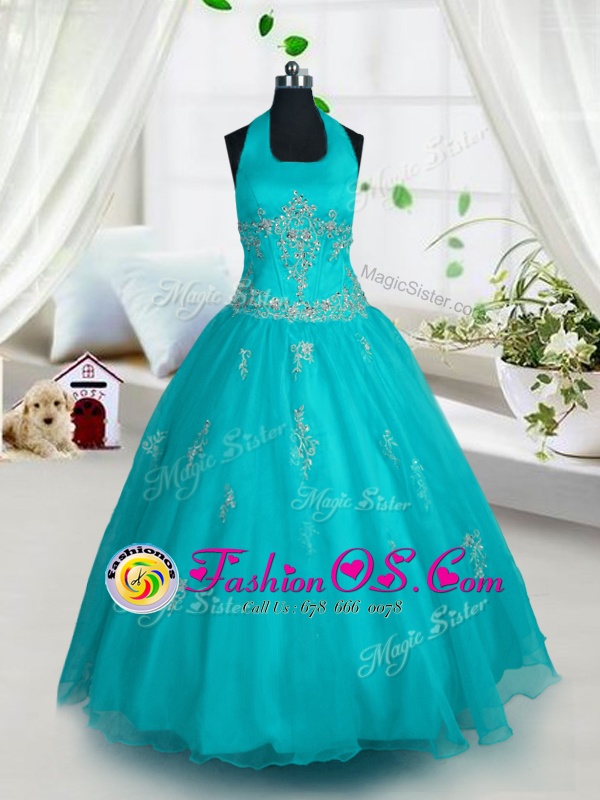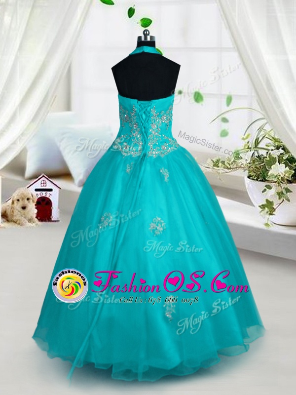 Sweet Aqua Blue Lace Up Halter Top Appliques Pageant Gowns For Girls Tulle Sleeveless