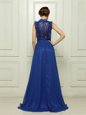 Sweet Blue Empire Chiffon High-neck Sleeveless Appliques With Train Zipper Evening Dress Brush Train