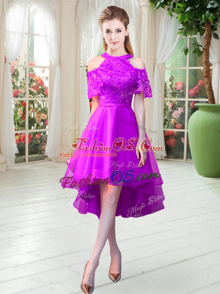 Sweet High Low Purple Prom Dress High-neck Short Sleeves Zipper