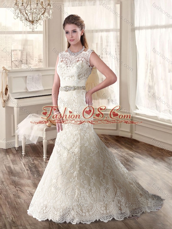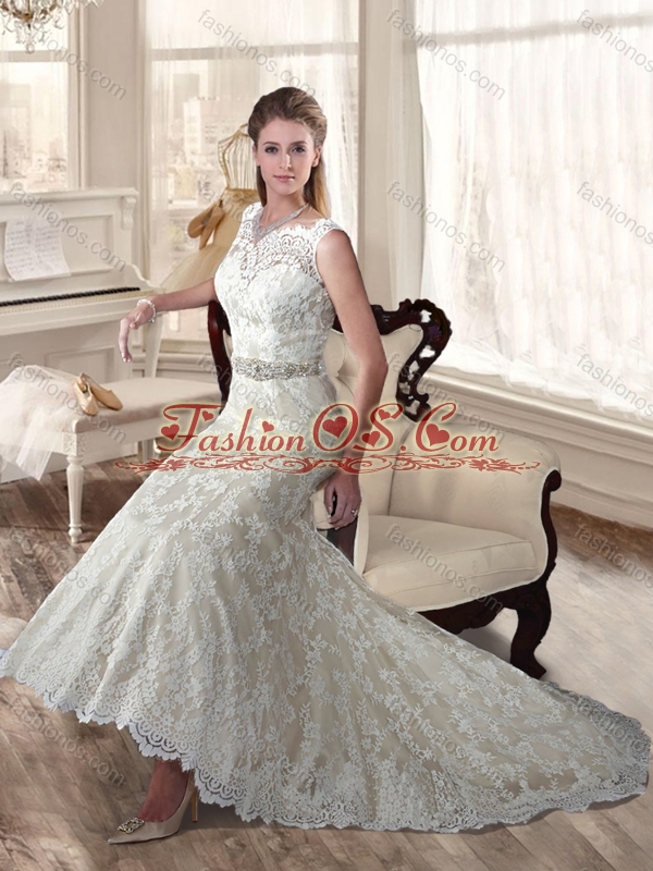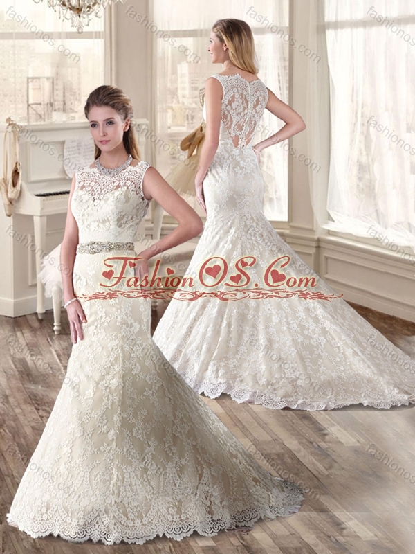 Sweet Mermaid Bateau Wedding Dresses with Belt and Lace