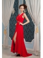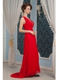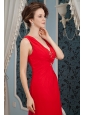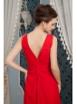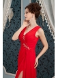 Sweet Red Column Prom Dress V-neck Beading Brush Train Chiffon