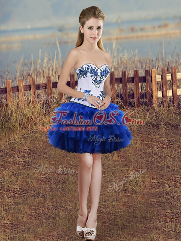 Sweet Royal Blue Organza Lace Up Sweetheart Sleeveless Floor Length Sweet 16 Quinceanera Dress Embroidery and Ruffled Layers and Bowknot