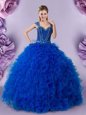 Home >  Quinceanera Dresses >  Popular Quinceanera Dresses > Sweet Straps Royal Blue Cap Sleeves Floor Length Beading and Ruffles Lace Up 15 Quinceanera Dress