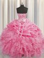 Home >  Quinceanera Dresses >  New Arrival Quinceanera Dresses > Sweet Visible Boning Floor Length Rose Pink Quinceanera Dress Organza Sleeveless Beading and Ruffles and Pick Ups