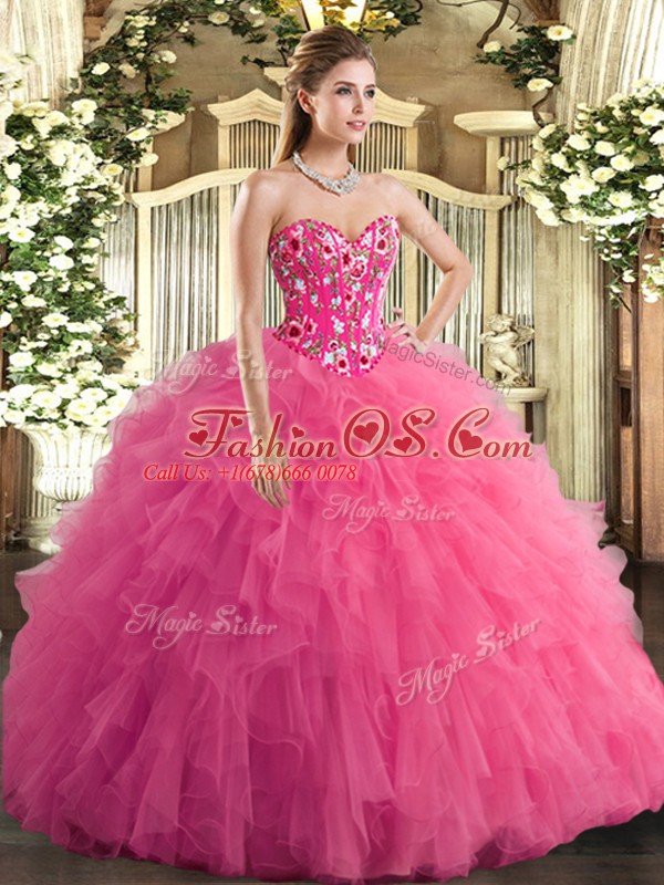 Sweetheart Sleeveless Lace Up Vestidos de Quinceanera Hot Pink Tulle