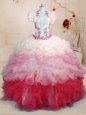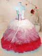 Home >  Quinceanera Dresses >  Unique Quinceanera Dresses > Sweetheart Sleeveless Organza Vestidos de Quinceanera Beading and Appliques and Ruffles Brush Train Lace Up