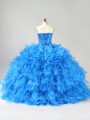 Sweetheart Sleeveless Quinceanera Gowns Floor Length Beading and Ruffles and Sequins Blue Organza