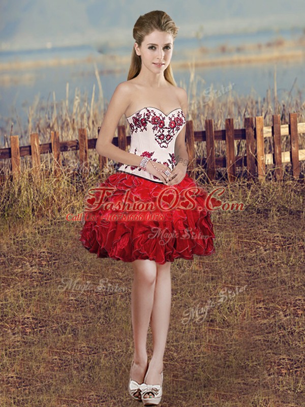 Sweetheart Sleeveless Sweet 16 Dress Floor Length Embroidery and Ruffles and Bowknot White And Red Organza