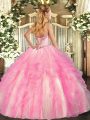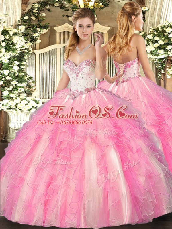 Sweetheart Sleeveless Sweet 16 Dresses Floor Length Beading and Ruffles Rose Pink Tulle
