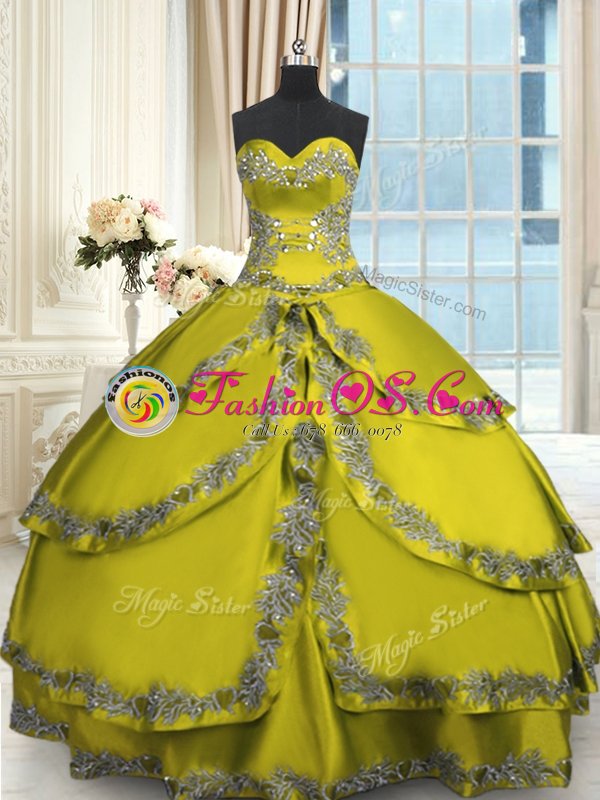 Home >  Quinceanera Dresses >  In Stock Quinceanera Dresses > Sweetheart Sleeveless Sweet 16 Quinceanera Dress Floor Length Beading and Appliques and Ruffled Layers Olive Green Taffeta