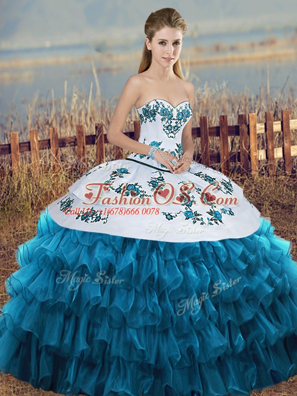 Sweetheart Sleeveless Vestidos de Quinceanera Floor Length Embroidery and Ruffled Layers and Bowknot Blue And White Organza