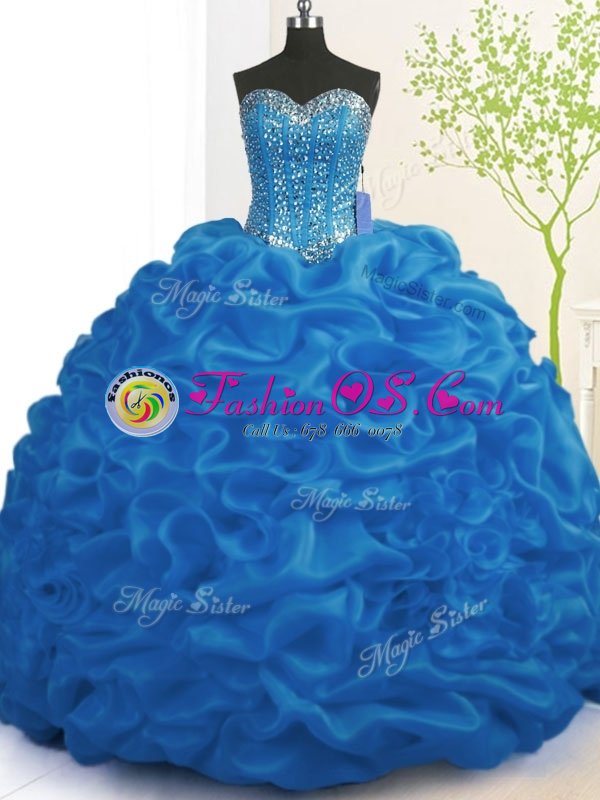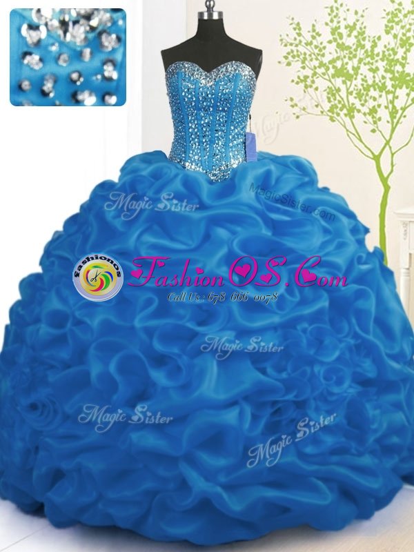 Home >  Quinceanera Dresses >  In Stock Quinceanera Dresses > Sweetheart Sleeveless Vestidos de Quinceanera With Brush Train Beading and Ruffles Royal Blue Organza