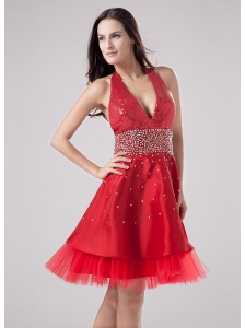 Luxurious Red Halter Prom Dress Beaded Decorate With Satin and Tulle