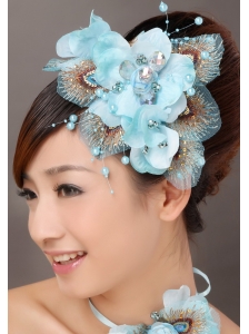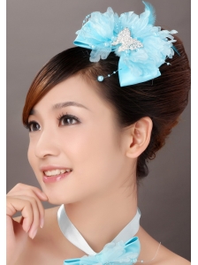 Popular Light Blue Taffeta Tulle Feather Beading Women’ s Fascinators