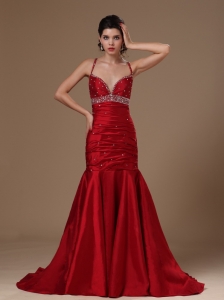 Wine Red Taffeta Mermaid Sweep Hottest Beaded Prom Celebrity Gowns For Custom Made