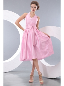 Baby Pink Halter Short Beaded Dama Dress With Bowknot