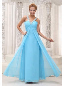 Aqua Blue Chiffon V-neck Beaded Long Dama Dress