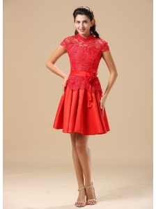 High-neck Red Mother Of The Bride Dress With Sash Lace and Taffeta In Juneau