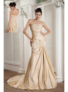 New Champagne A-line Strapless Prom / Evening Dress Satin Appliques Court Train