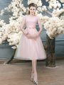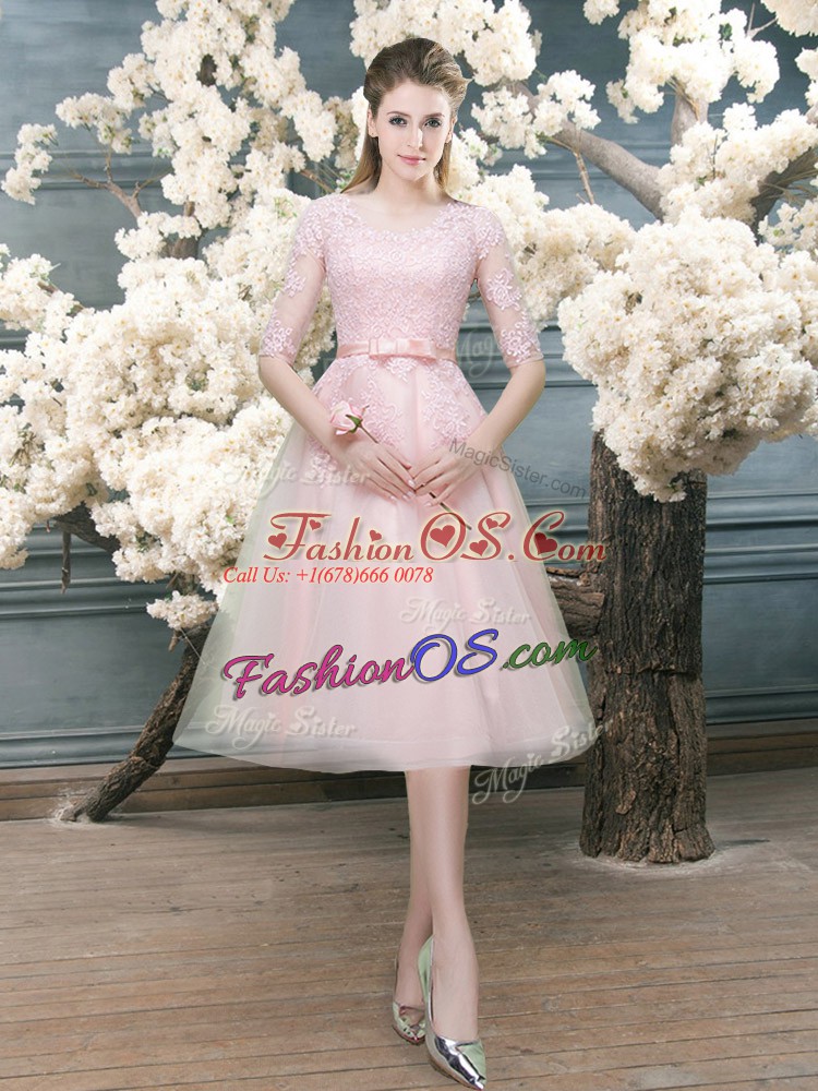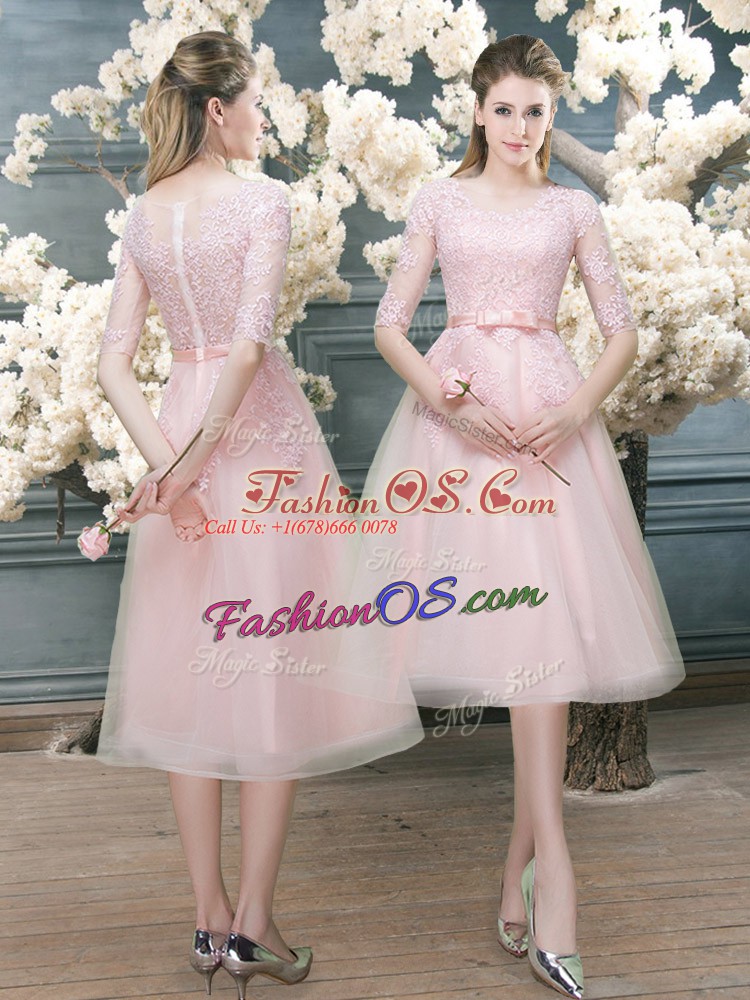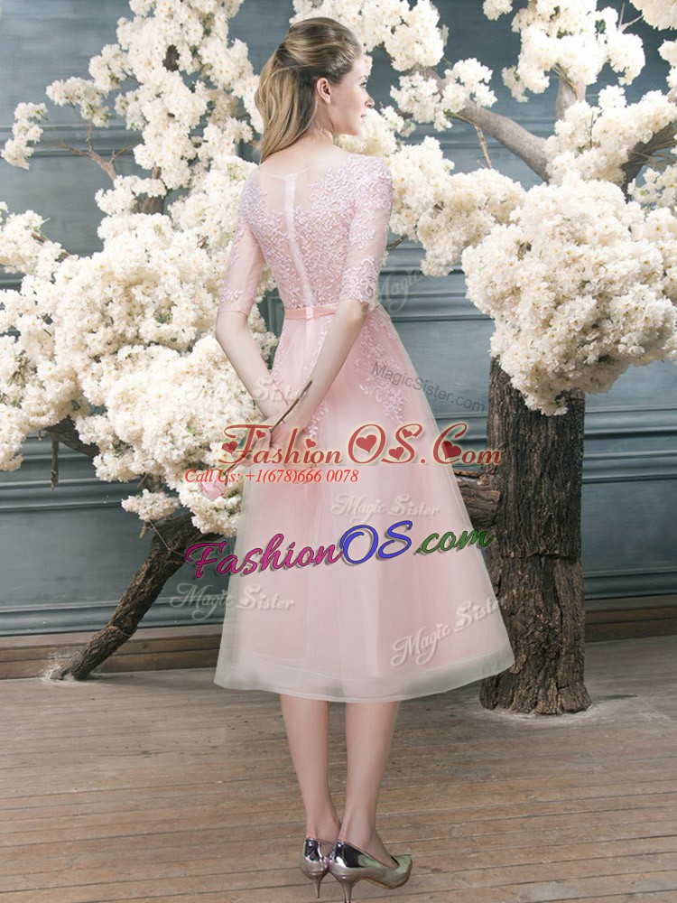 Tea Length A-line Half Sleeves Pink Prom Dress Zipper