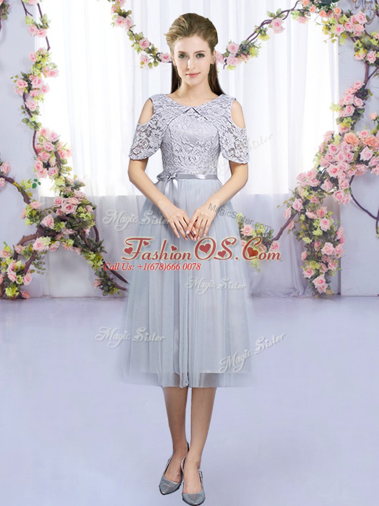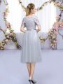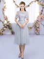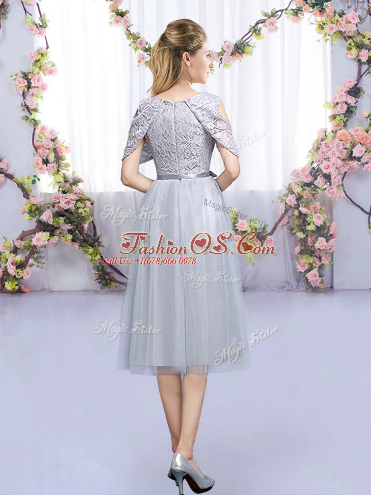 Tea Length Grey Quinceanera Court of Honor Dress Tulle Sleeveless Lace and Belt