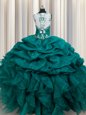 Teal Ball Gowns Organza Straps Sleeveless Beading and Ruffles and Pick Ups Floor Length Zipper Quince Ball Gowns
