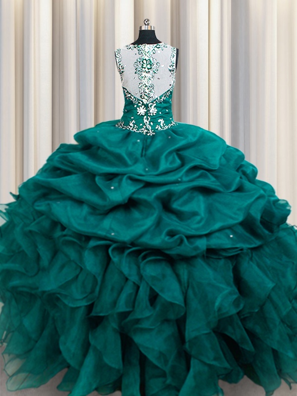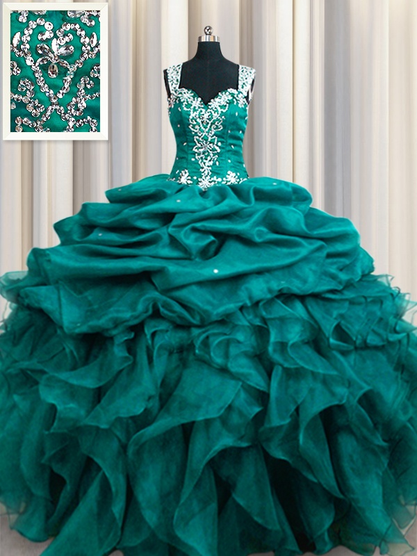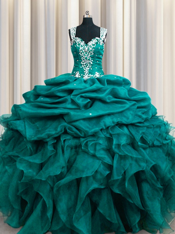 Home >  Quinceanera Dresses >  In Stock Quinceanera Dresses > Teal Ball Gowns Organza Straps Sleeveless Beading and Ruffles and Pick Ups Floor Length Zipper Quince Ball Gowns