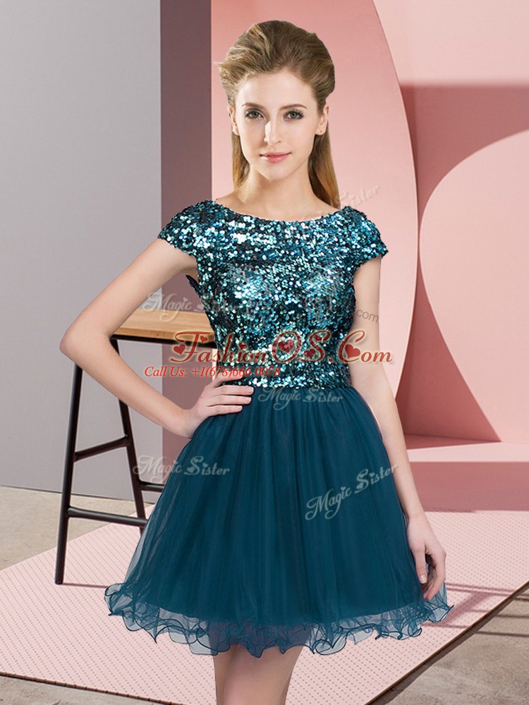 Teal Cap Sleeves Sequins Mini Length Dama Dress for Quinceanera