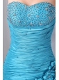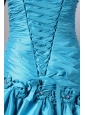 Simple while stunning of this blue gown. The sweetheart neckline style bodice is characterized by embellished beadwork and exquisite ruchings that can show your natural waistline, while the flowers in the waist section is so chic that adds more decency and elegance to this design. The floor length skirt is full of glamorous pick-ups to create a preety shape, and a lace up closure completes the look.