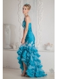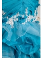 Exquisite and gorgeous blue prom dress. The sheathy bodice which flatters the slim line covered with pleates and scattered appliques and bead works features a sweetheart neckline and an asymmetrical one shoulder strap comprised of delicate flowers and the same appliques and beads. The high-low skirt full of multi-tiered ruffles alternately in taffeta and organza contributes to the intrication and luxury. Zipper up back completes the elegant look. You will have heads turning in this dress!
