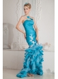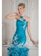 Teal Mermaid One Shoulder Ruch and Appliques Prom Dress High-low Organza