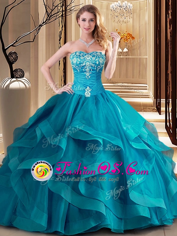 Teal Sleeveless Embroidery and Ruffles Floor Length Quinceanera Gown