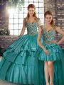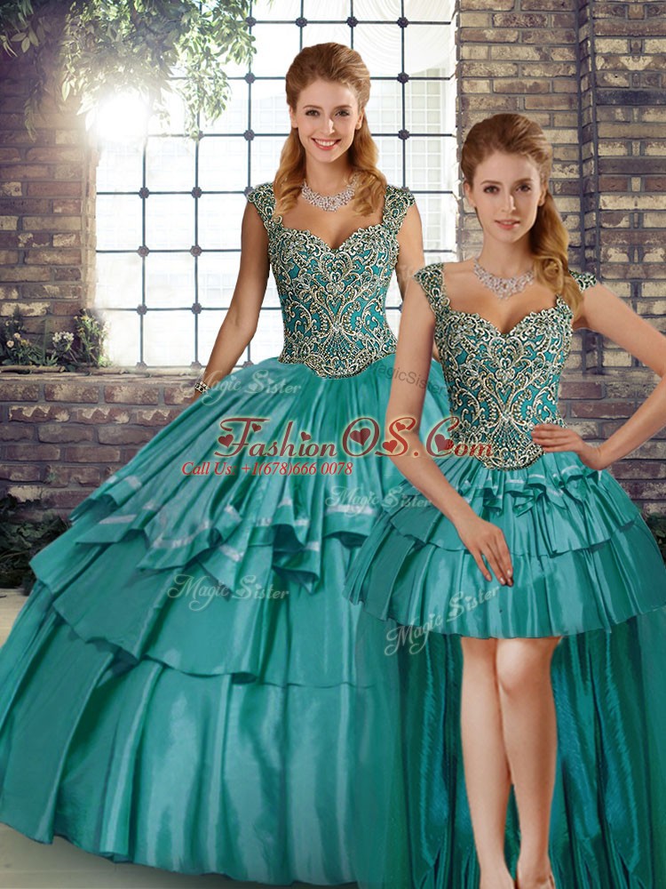 Teal Straps Neckline Beading and Ruffled Layers Quince Ball Gowns Sleeveless Lace Up