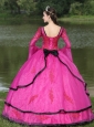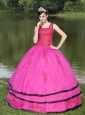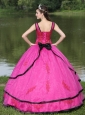 A gorgeous fushcia ball gown with contrasting red trim and appliques. The fabulous quinceanera dress pushes you in the spotlight, which features a two straps bodice with detachable sleeves which were heavily embellished as well. The floor length skirt is full with multi-tiered organza material and eye-catching appliques scattered throughout the front and the back giving this gown an enchanting style you're sure to love. A lovely black bow decorates the corset-style closure that completes the look and secures the dress in place.