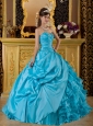 A graceful elegant quinceanera gall features with a sweetheart neckline and a pleated bodice. The appliques scatters over the bodice add a amazing look. The heavily ruffled ball gown has two tiers, the out layer is splited taffeta with pick-ups and the inner layer is tulle ruffles achieving the lovely, full and cute. The lace up back is the finishment of the look.