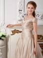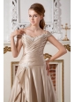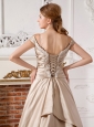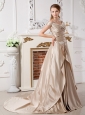 Sheath-style dresses have a timeless appeal that dresses of other designs cannot duplicate. They are elegant, ever fashionable and quite flattering to just about any body type. This one is made from a lovely taffeta fabric and features two shoulder straps and off the shoulder neckline bodice with a wrapped texture throughout the mid-section. The top of the bodice as well as the mid-section feature beautiful appliques that add a stunning effect. The long skirt with layers of fabric covered on both sides cascading beautifully to your feet. The back of the skirt extends into a gorgeous sweeping train that creates a beautiful silhouette when worn.